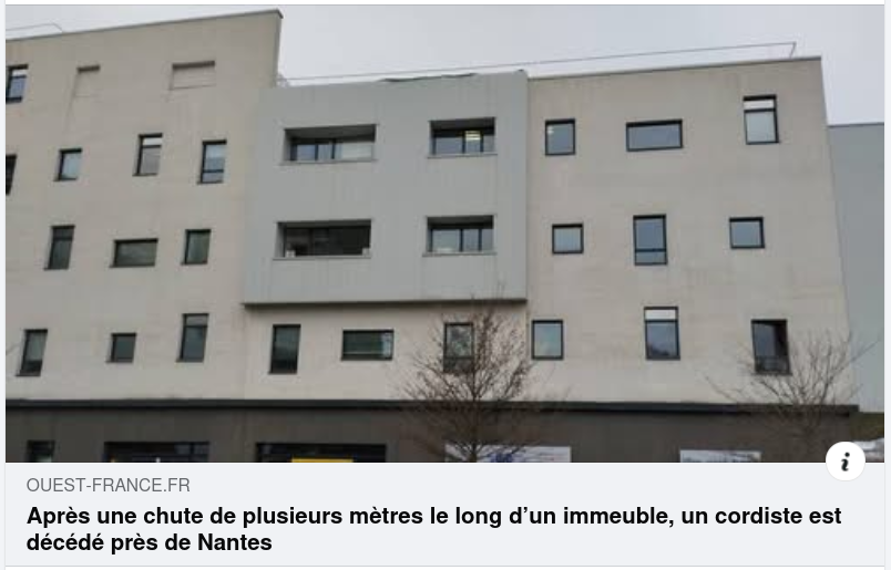 En tout début de semaine, lundi 8 décembre, un nouveau collègue cordiste a perdu la vie au travail à Saint-Herblain près de Nantes. Une infinie tristesse à laquelle on ne pourra jamais s’habituer… Alors qu’il travaillait en haut d’un immeuble, c’est une chute d’une vingtaine de mètres qui a coûté la vie de ce collègue âgé de 53 ans. Nous ne connaissons pas à ce stade les circonstances du drame. Les mots sont durs, mais ne font finalement que refléter la triste réalité de notre profession. Cette tragédie s’ajoute à la (déjà trop longue) liste de nos collègues décédés et la porte au nombre de 37 cordistes morts au travail depuis 2006. En ce moment très douloureux, d’autant plus à l’approche des fêtes, toutes nos pensées et notre soutien vont vers sa famille, ses amis, son collègue de travail témoin de ce terrible drame…
