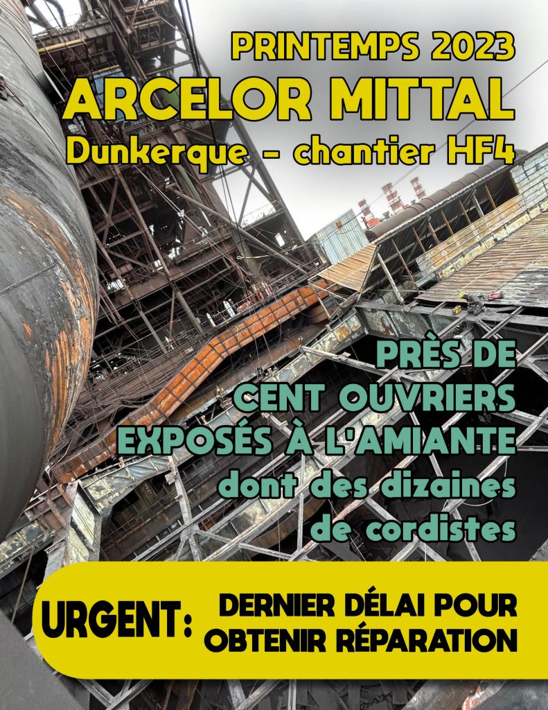 SI VOUS FAÎTES PARTI DES CORDISTES EXPOSÉS sur ce chantier, c’est le moment ou jamais de vous joindre à cette procédure et obtenir réparation. En effet, vous avez DEUX ANS pour lancer la procédure à compté du moment où vous avez été informés (remise de la fiche d’exposition, ou réception du courrier de l’inspection du travail). Pour certains, ce délai arrivent à échéances dans les jours et semaines à venir ! À noter que la procédure sera dirigée uniquement contre Arcelor Mittal et non pas contre vos employeurs.